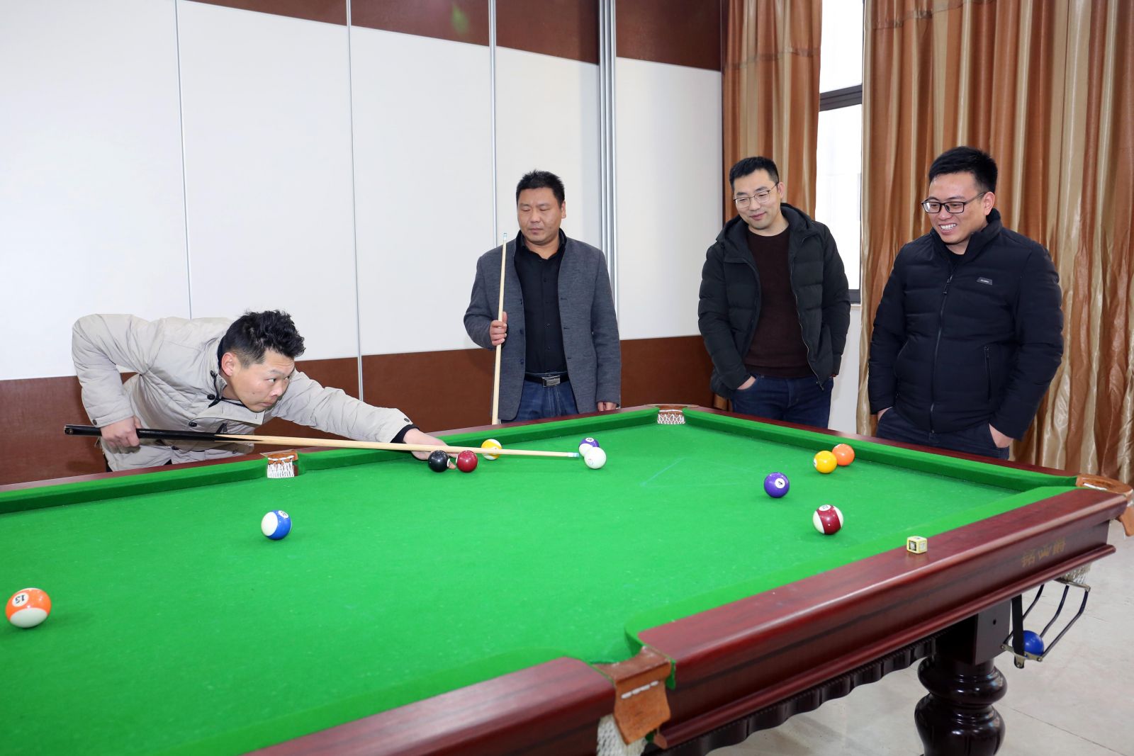 一樓展示廳臺球間充滿了臺球比賽高昂的激情,比賽時選手們精神抖擻、積極應對,時而大力進攻,一桿定乾坤;時而輕碰防守,局勢撲朔迷離。都發(fā)揮出了自己的最高水平,使比賽高潮迭起,充分展現(xiàn)了臺球運動的魅力。